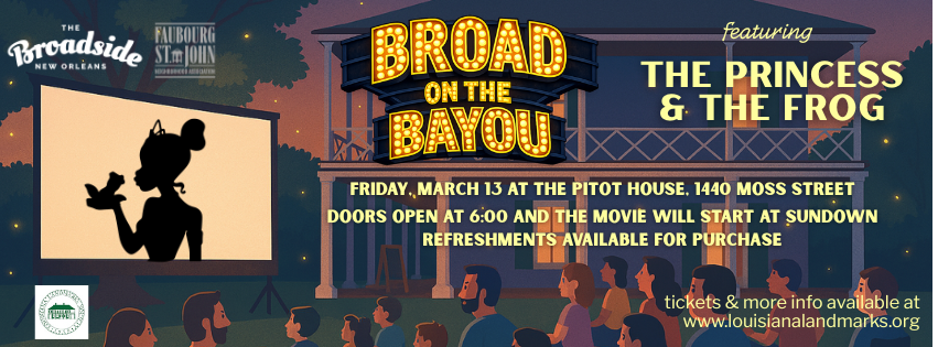 Pitot House is thrilled to partner with The Broadside New Orleans and The Faubourg St. John Neighborhood Association to host our first Broadside on the Bayou featuring THE PRINCESS AND THE FROG! Please join us with your favorite blanket or chair to enjoy a movie with the kids on the meadow of Pitot House on Friday, March 13 at 5:30 PM. Doors open early with refreshments available for purchase and the movie will start when then sun sets at 7:00. Tickets will also be available at the door but can be purchased ahead of time using the link below.